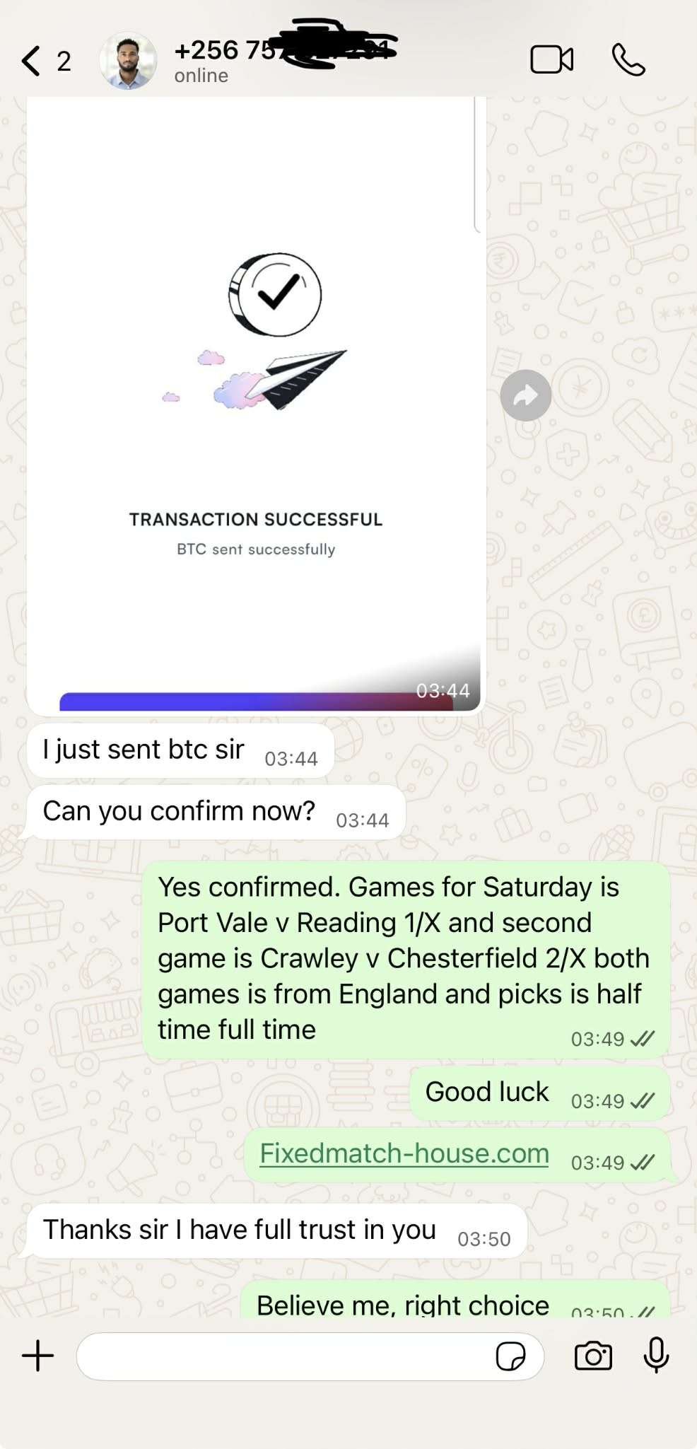 WhatsApp conversation with new client who receive our fixed matches